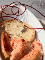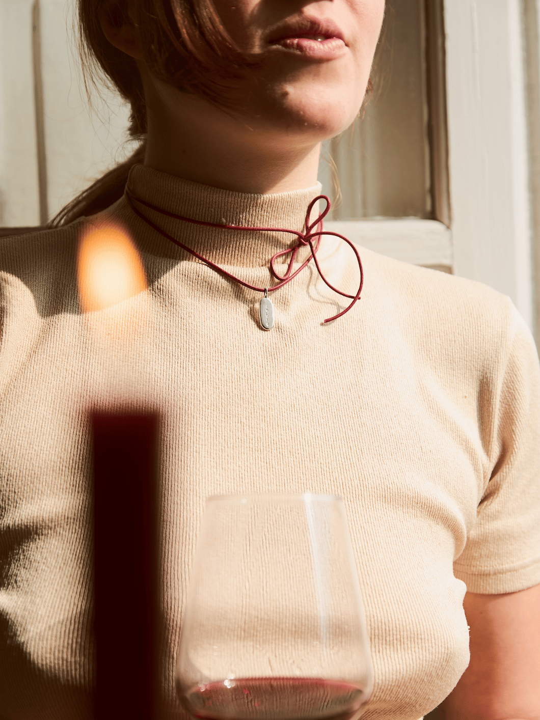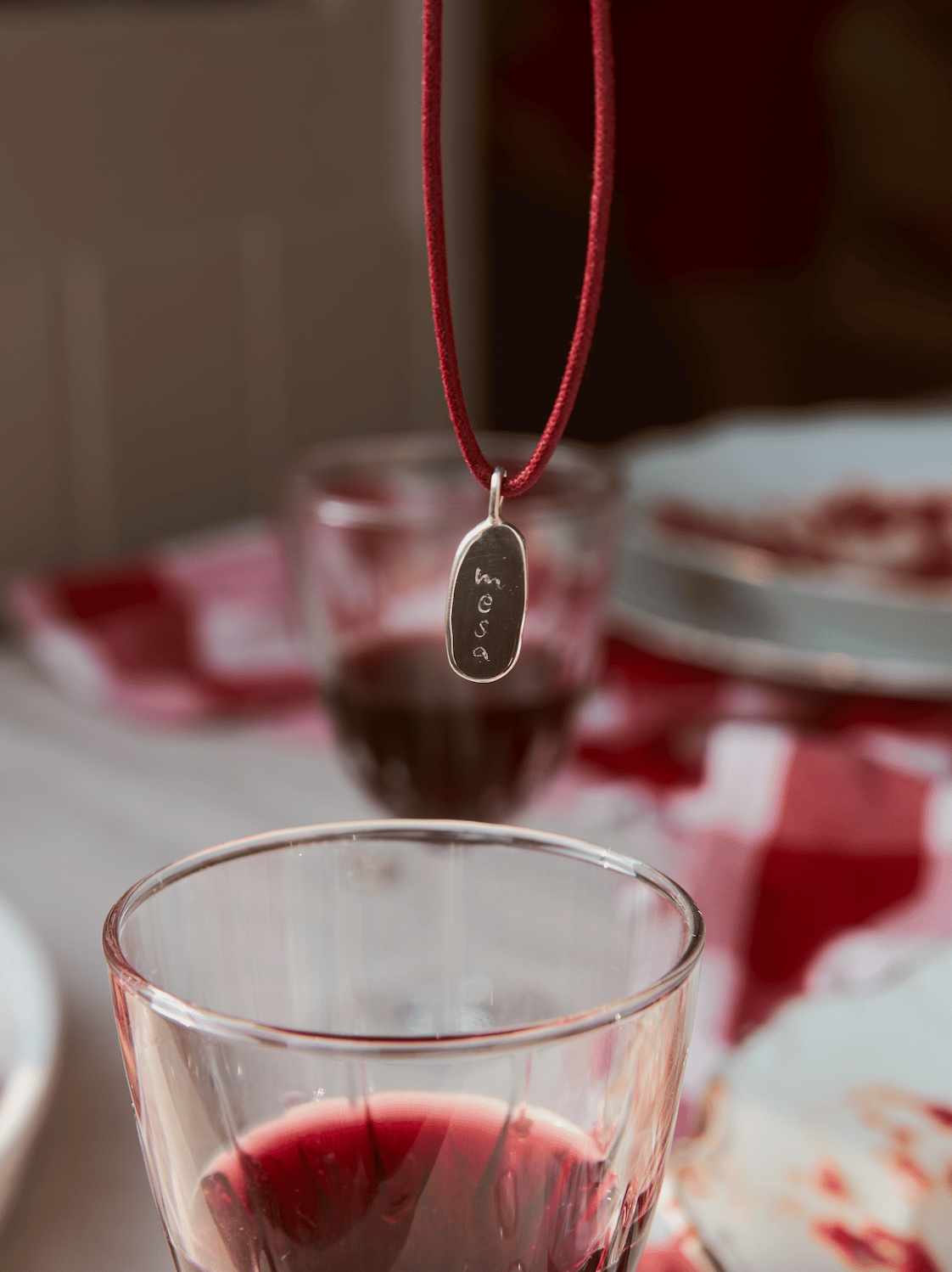 Un ciondolo minimal e organico che porta inciso un invito a un momento di condivisione autentico, nonché il nome della collezione, "sobremesa".
